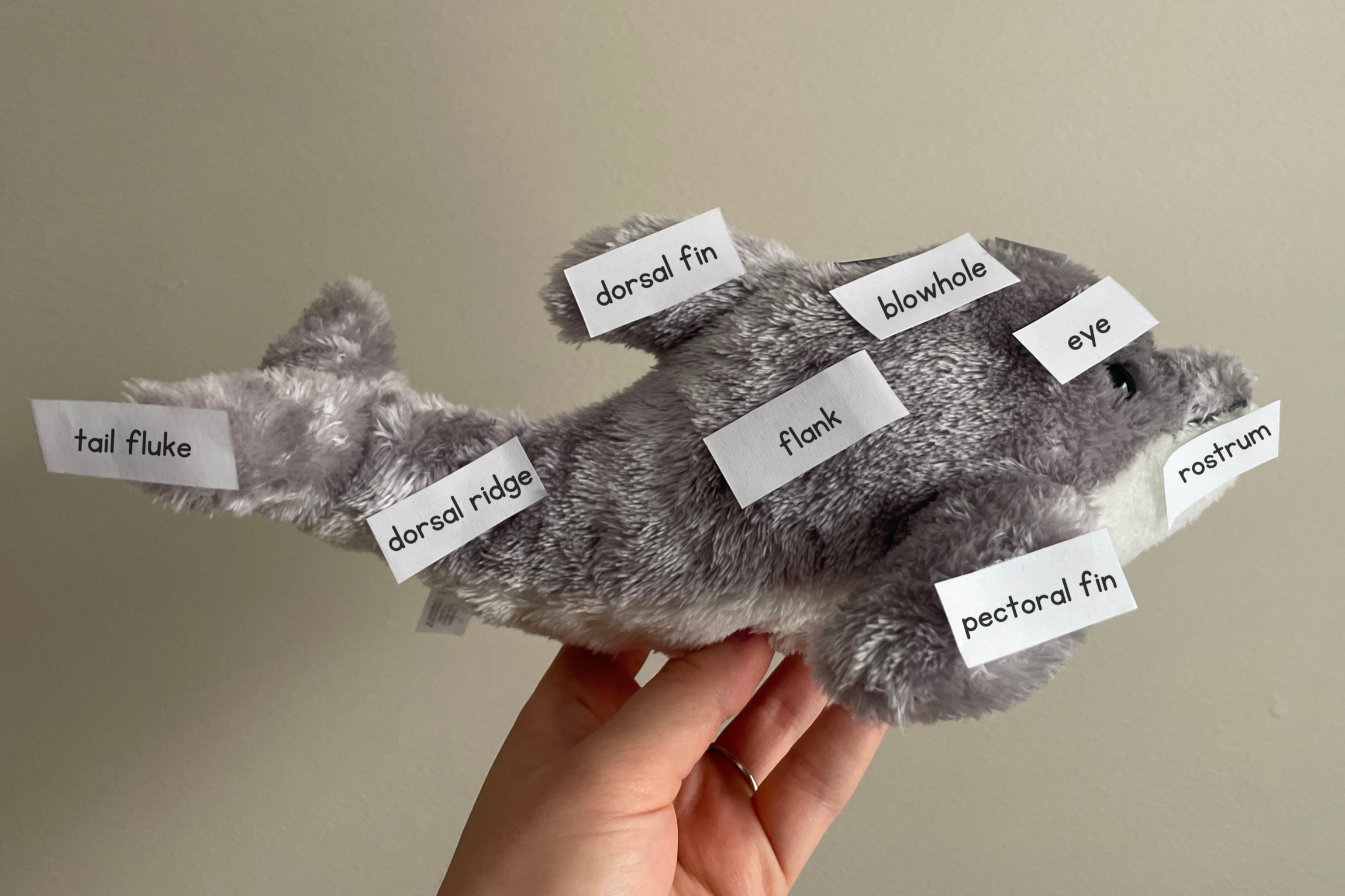 The last activity that is fun for all ages but especially pertinent for younger kids is a different version of the dolphin anatomy worksheet, but using a stuffed animal instead of the worksheet dolphin. For this version you simply print out the labels (or write your own) and stick the labels directly onto a dolphin stuffie. This is great for littles because they can take turns sticking the labels on together. We happen to have this stuffie at home so that is what we used.